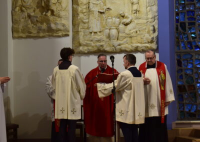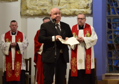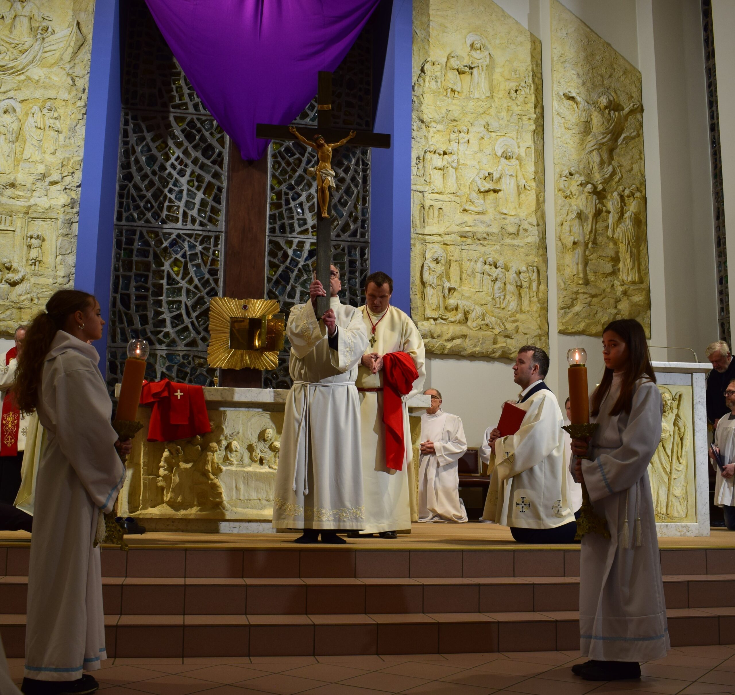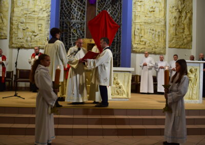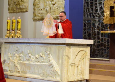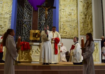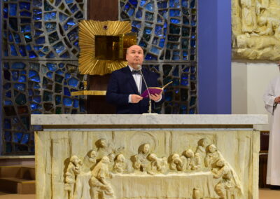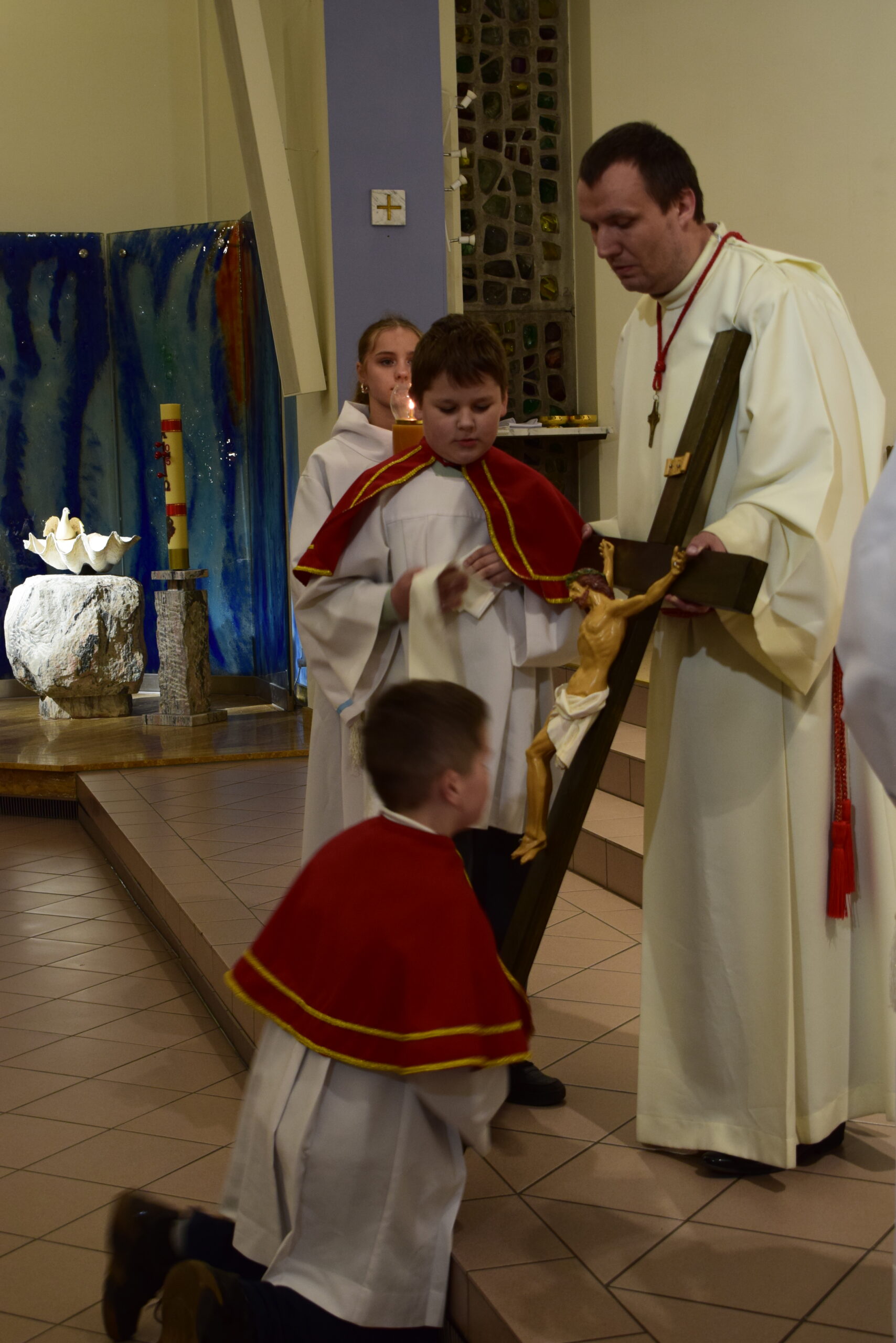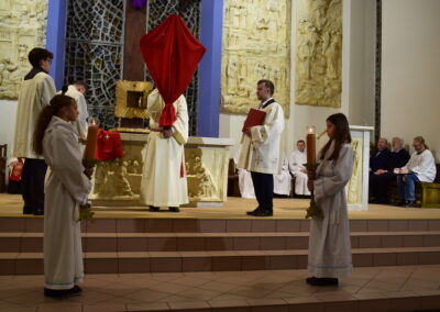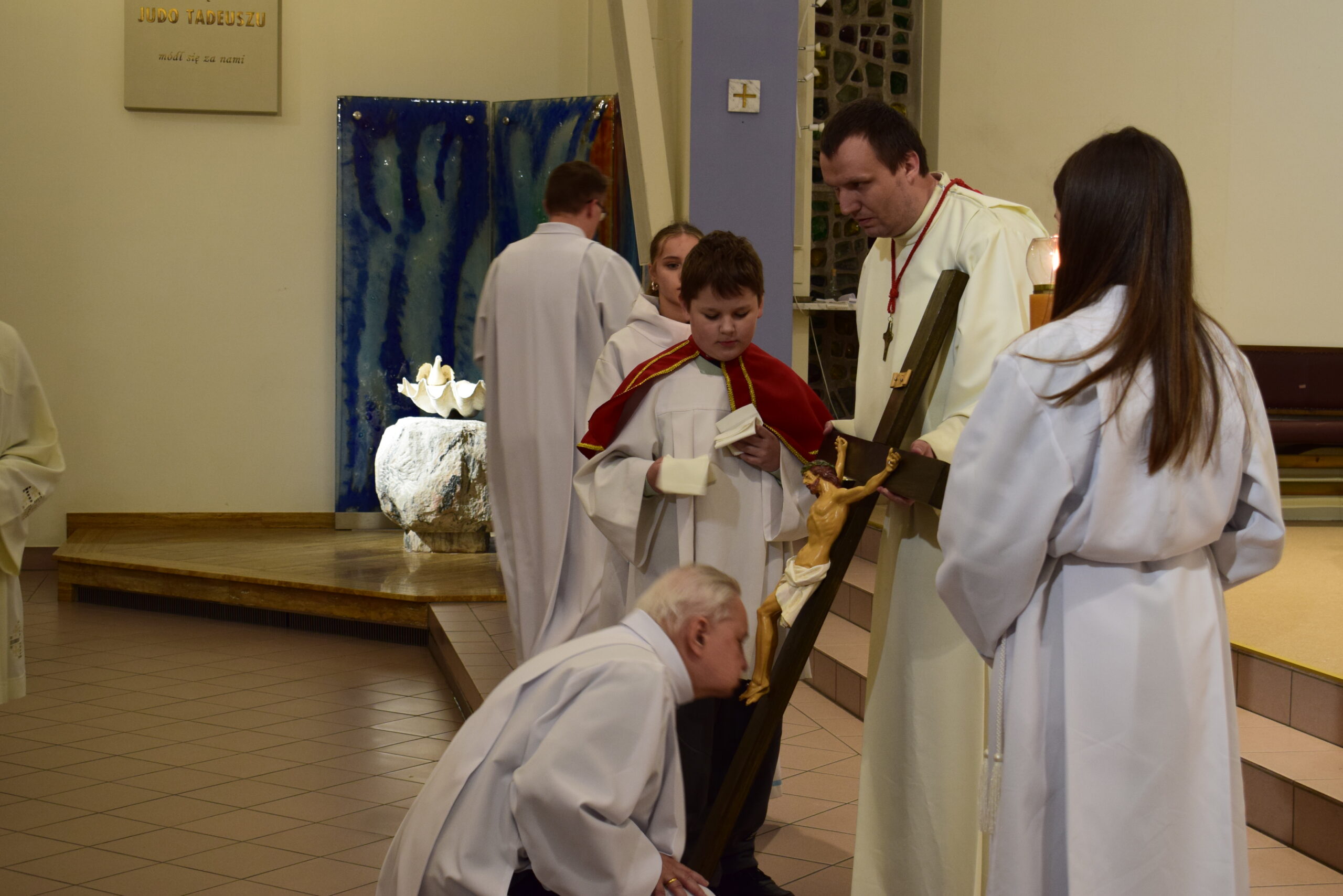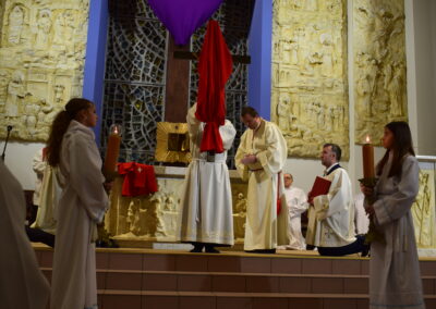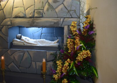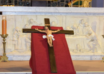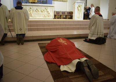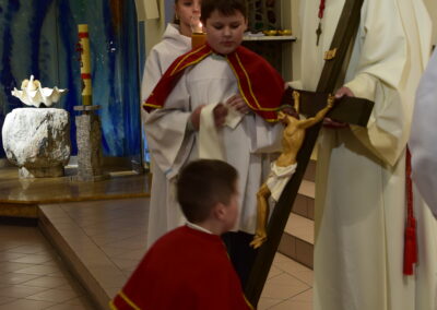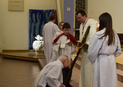 Wielki Piątek to dzień męki i śmierci Pana Jezusa na krzyżu, przeżywany w Kościele w atmosferze ciszy, powagi i głębokiej modlitwy. W naszej parafii wierni licznie uczestniczyli w Liturgii Męki Pańskiej, rozważając wydarzenia zbawczej ofiary Chrystusa. Centralnym momentem liturgii była adoracja krzyża. Ważnym elementem była także uroczysta modlitwa powszechna obejmująca potrzeby całego Kościoła i świata. Po zakończeniu liturgii Najświętszy Sakrament został przeniesiony do Grobu Pańskiego, gdzie wierni trwali na adoracji, czuwając przy Chrystusie i rozważając tajemnicę Jego męki i śmierci.